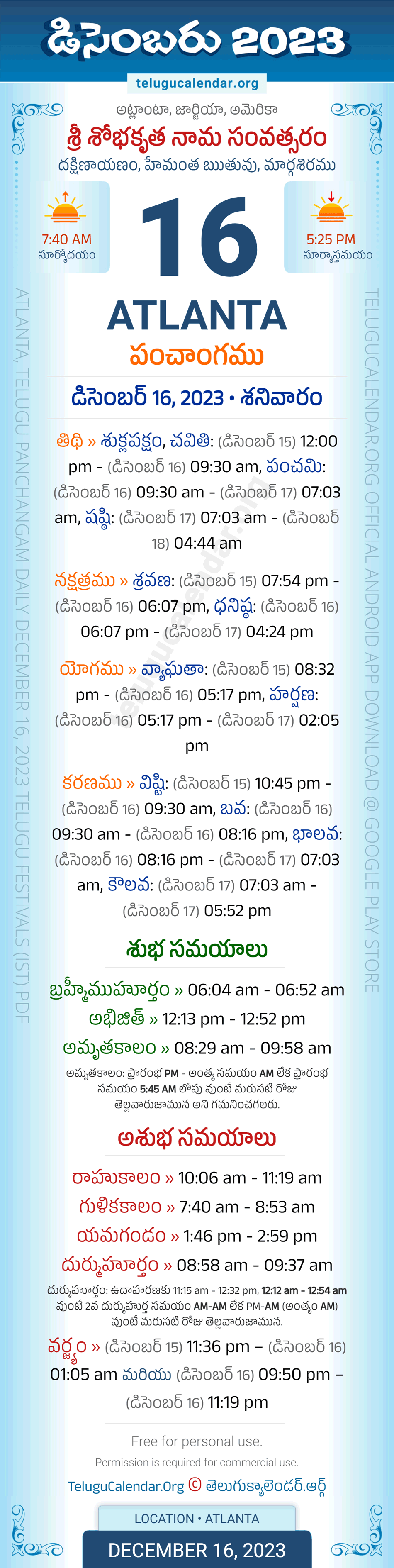 Apart from the Panchangam December 16, 2023 Atlanta Telugu Calendar Daily Sheet, you can also find the Sunrise and Sunset (Middle Limb) timings, Paksham, Telugu Year, Yanam, Rutuvu, Telugu Month. Today's Atlanta Auspicious Timings December 16, 2023 (Shubha Muhuratam Today Good Timings like Abhijit Muhurtham, Amruta Kalam & Brahma Muhurtham) and Today's Atlanta Inauspicious Timings December 16, 2023 (Bad Timings like Durmuhurtham, Rahukalam, Gulika kalam & Yamagandam) with starting and end timings in the above image.