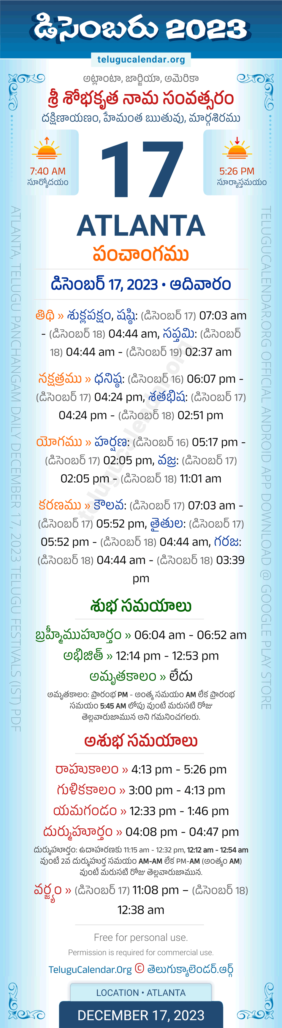 Atlanta Panchangam December 17, 2023 Daily Sheet in Telugu... Atlanta Telugu Panchangam Sunday, December 17, 2023, Today's Atlanta Tithi: Sukla Paksham, Shashthi: (Dec 17) 07:03 am - (Dec 18) 04:44 am, Saptami: (Dec 18) 04:44 am - (Dec 19) 02:37 am, Today's Atlanta Nakshatram: Dhanishta: (Dec 16) 06:07 pm - (Dec 17) 04:24 pm, Shathabhisha: (Dec 17) 04:24 pm - (Dec 18) 02:51 pm, Telugu Year: Sri Sobhakritu Nama Samvatsaram, Vedic Aayana: Dakshinayanam, Vedic Rutuvu: Hemanta, Chandramasa (Amanta): Margasiramu. Below image showing information about the 5 attributes of the day, viz., Varam, Tithi, Nakshatram, Yogam & Karanam along with starting and end timings. Read more