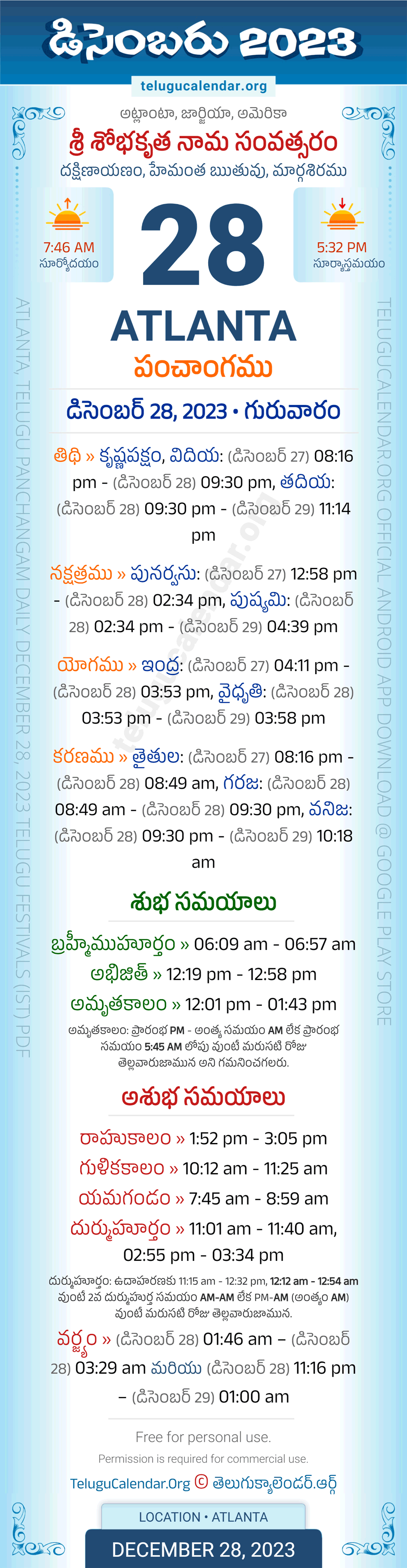 Download » December 28, 2023 » Atlanta (USA) Telugu Panchangam Daily Sheet with Auspicious and Inauspicious Timings.