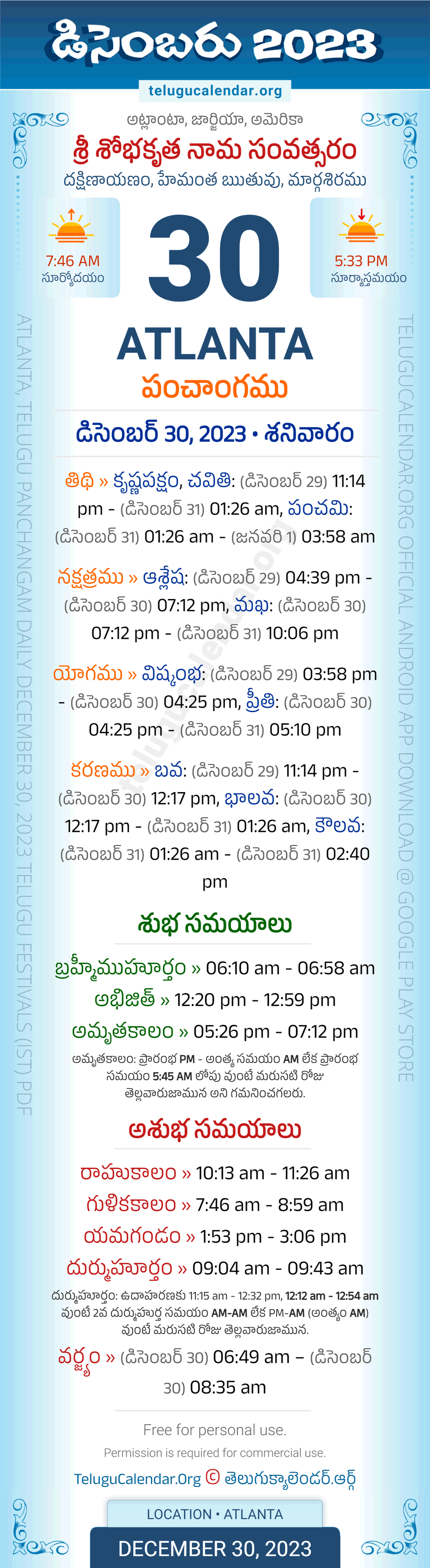 Atlanta Panchangam December 30, 2023 Daily Sheet in Telugu... Atlanta Telugu Panchangam Saturday, December 30, 2023, Today's Atlanta Tithi: Krishna Paksham, Chavithi: (Dec 29) 11:14 pm - (Dec 31) 01:26 am, Panchami: (Dec 31) 01:26 am - (Jan 1) 03:58 am, Today's Atlanta Nakshatram: Ashlesha: (Dec 29) 04:39 pm - (Dec 30) 07:12 pm, Makha: (Dec 30) 07:12 pm - (Dec 31) 10:06 pm, Telugu Year: Sri Sobhakritu Nama Samvatsaram, Vedic Aayana: Dakshinayanam, Vedic Rutuvu: Hemanta, Chandramasa (Amanta): Margasiramu. Below image showing information about the 5 attributes of the day, viz., Varam, Tithi, Nakshatram, Yogam & Karanam along with starting and end timings. Read more