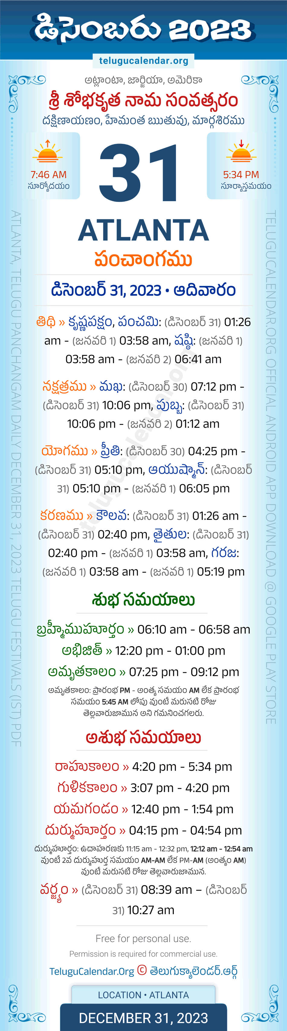 Download » December 31, 2023 » Atlanta (USA) Telugu Panchangam Daily Sheet with Auspicious and Inauspicious Timings.