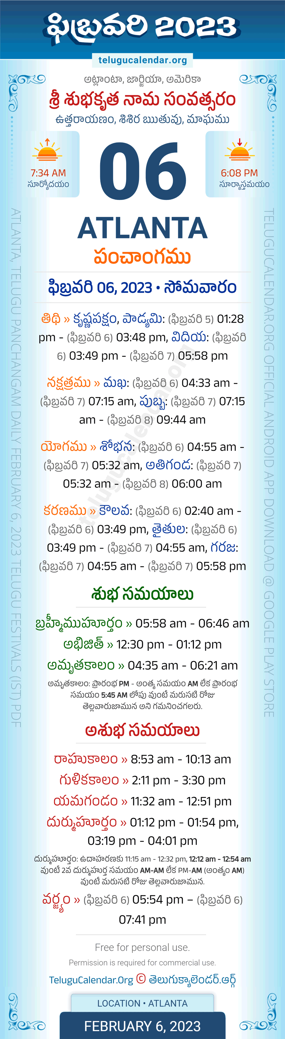 Download » February 6, 2023 » Atlanta (USA) Telugu Panchangam Daily Sheet with Auspicious and Inauspicious Timings.