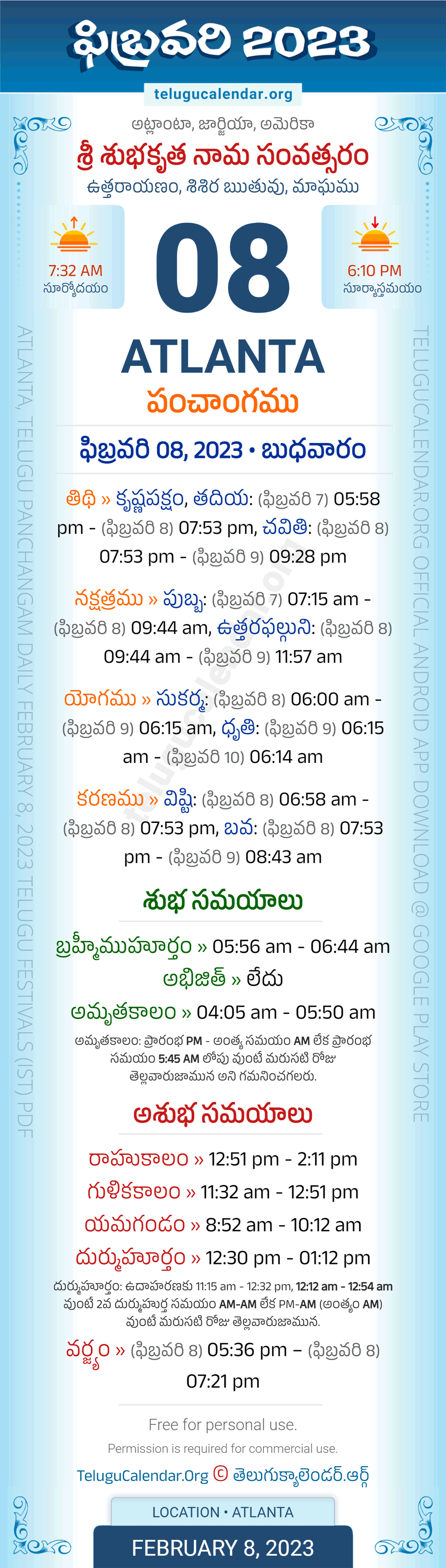 Download » February 8, 2023 » Atlanta (USA) Telugu Panchangam Daily Sheet with Auspicious and Inauspicious Timings.