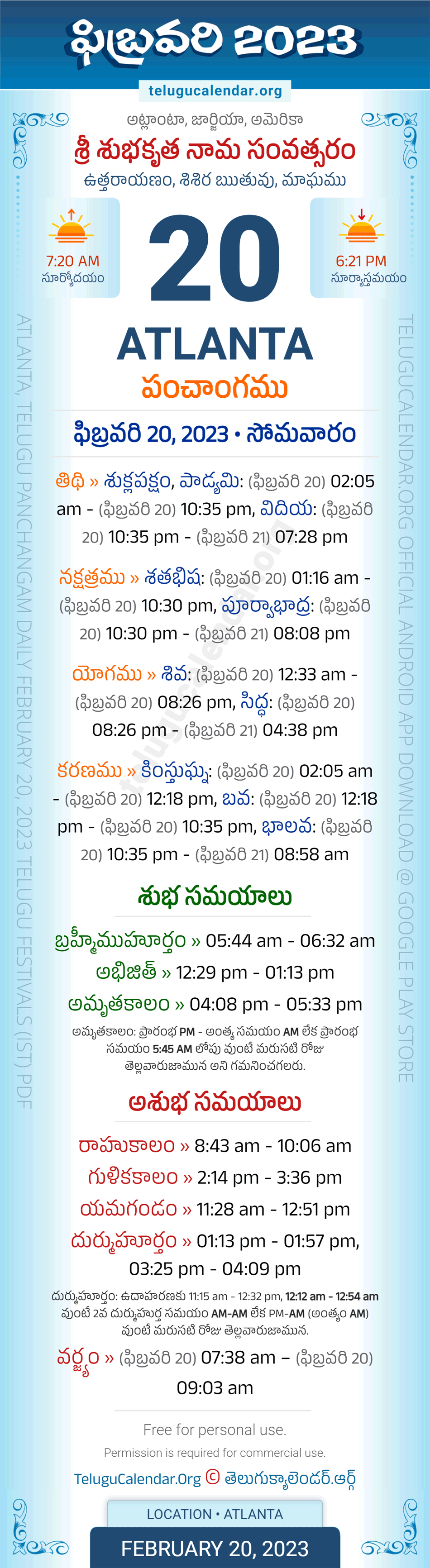 Download » February 20, 2023 » Atlanta (USA) Telugu Panchangam Daily Sheet with Auspicious and Inauspicious Timings.