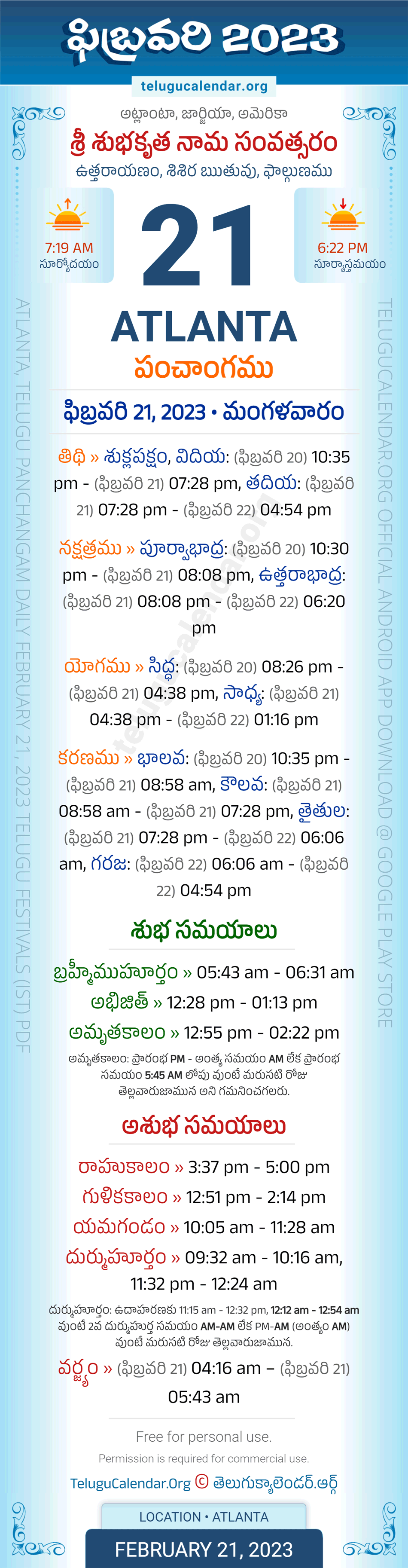 Download » February 21, 2023 » Atlanta (USA) Telugu Panchangam Daily Sheet with Auspicious and Inauspicious Timings.