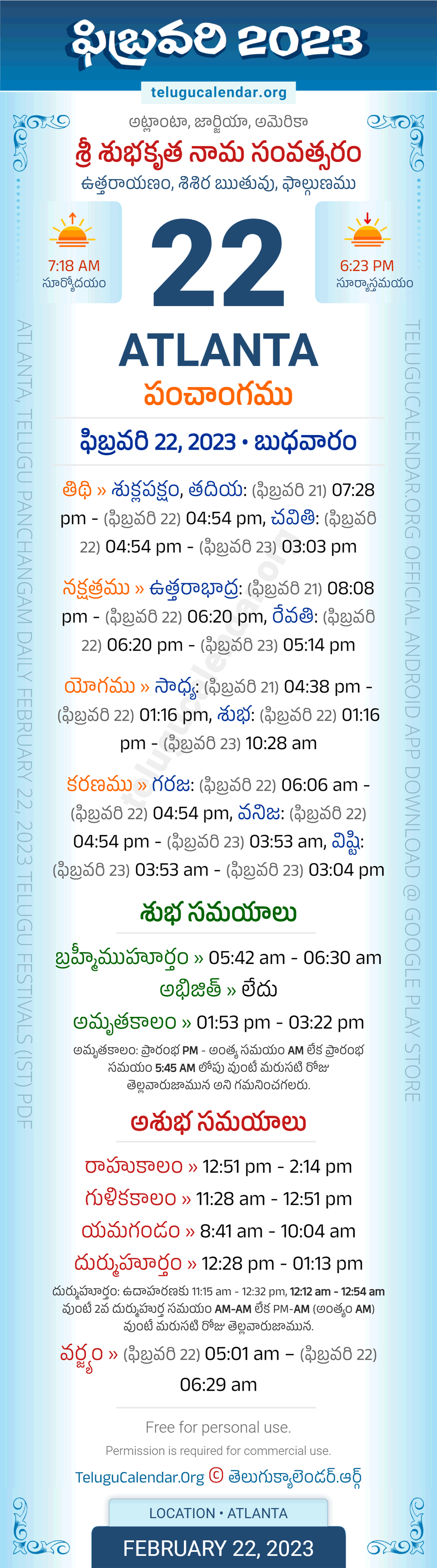 Download » February 22, 2023 » Atlanta (USA) Telugu Panchangam Daily Sheet with Auspicious and Inauspicious Timings.