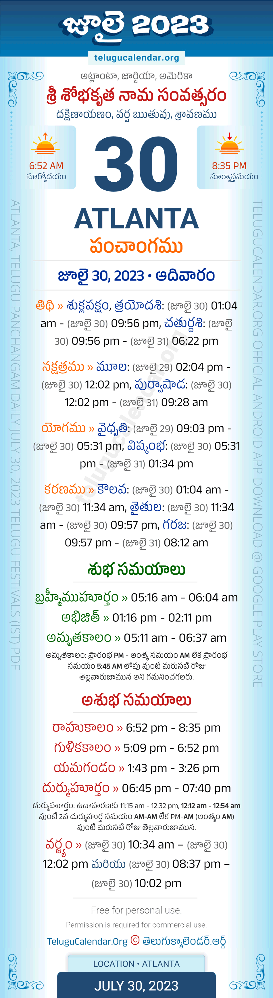 Download » July 30, 2023 » Atlanta (USA) Telugu Panchangam Daily Sheet with Auspicious and Inauspicious Timings.