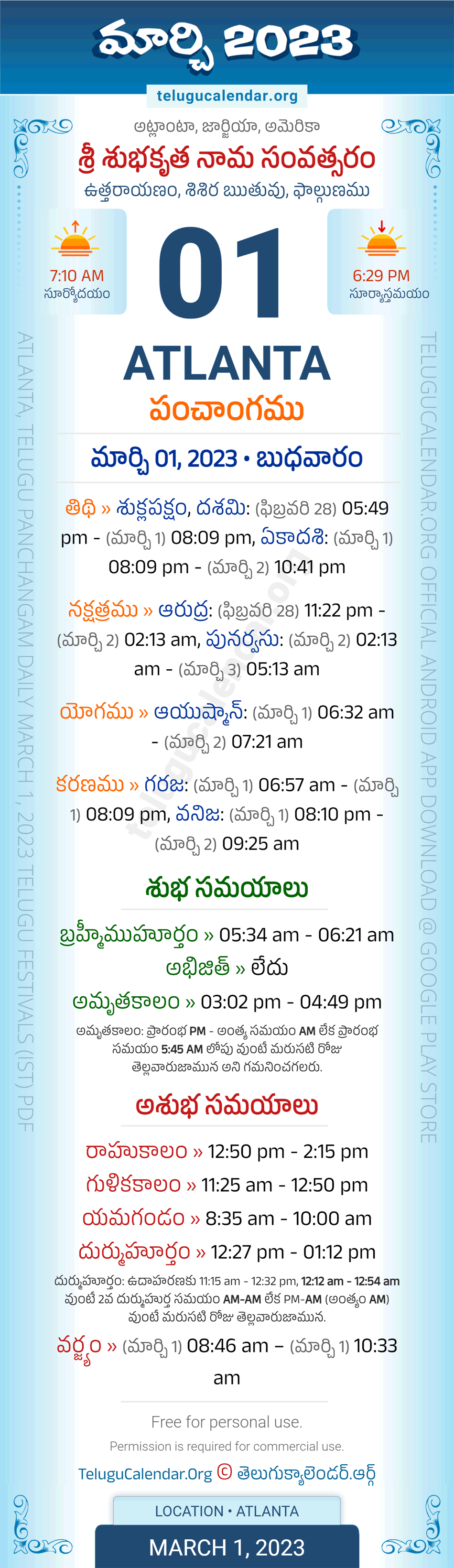 Download » March 1, 2023 » Atlanta (USA) Telugu Panchangam Daily Sheet with Auspicious and Inauspicious Timings.