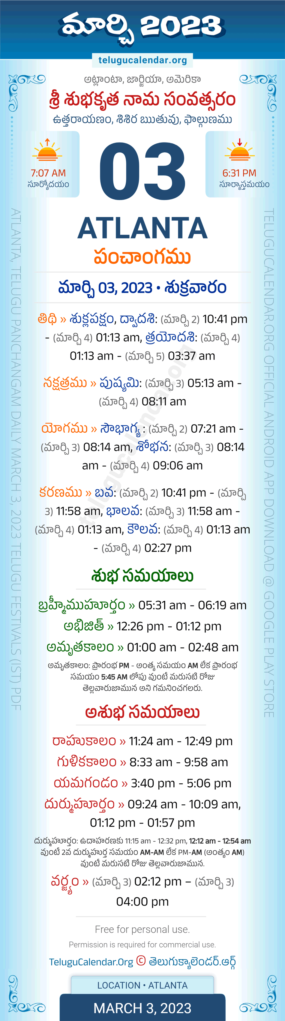 Download » March 3, 2023 » Atlanta (USA) Telugu Panchangam Daily Sheet with Auspicious and Inauspicious Timings.