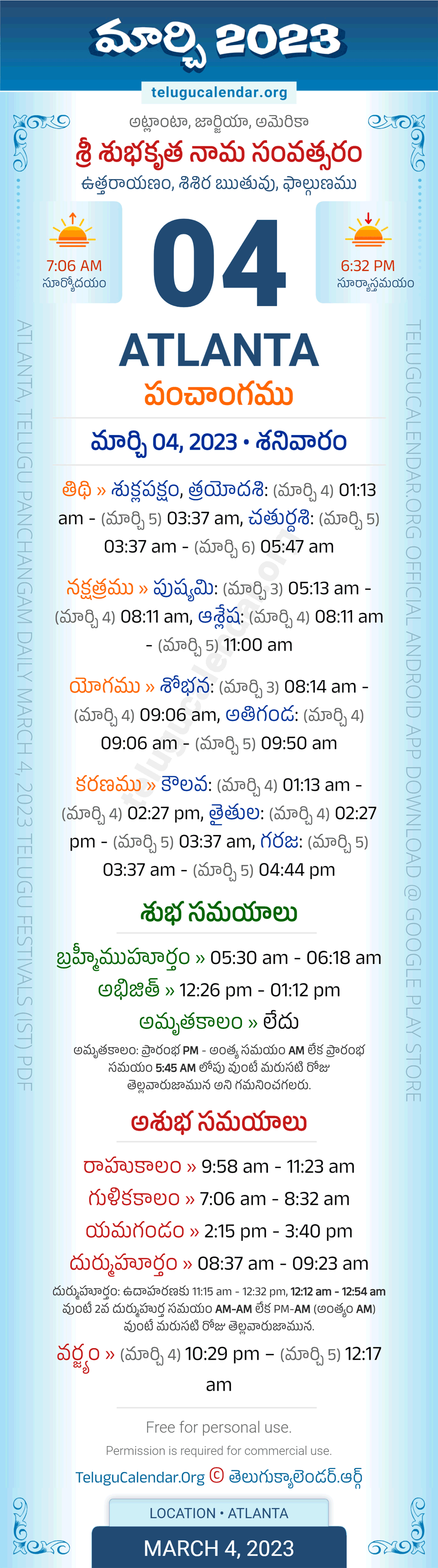 Download » March 4, 2023 » Atlanta (USA) Telugu Panchangam Daily Sheet with Auspicious and Inauspicious Timings.
