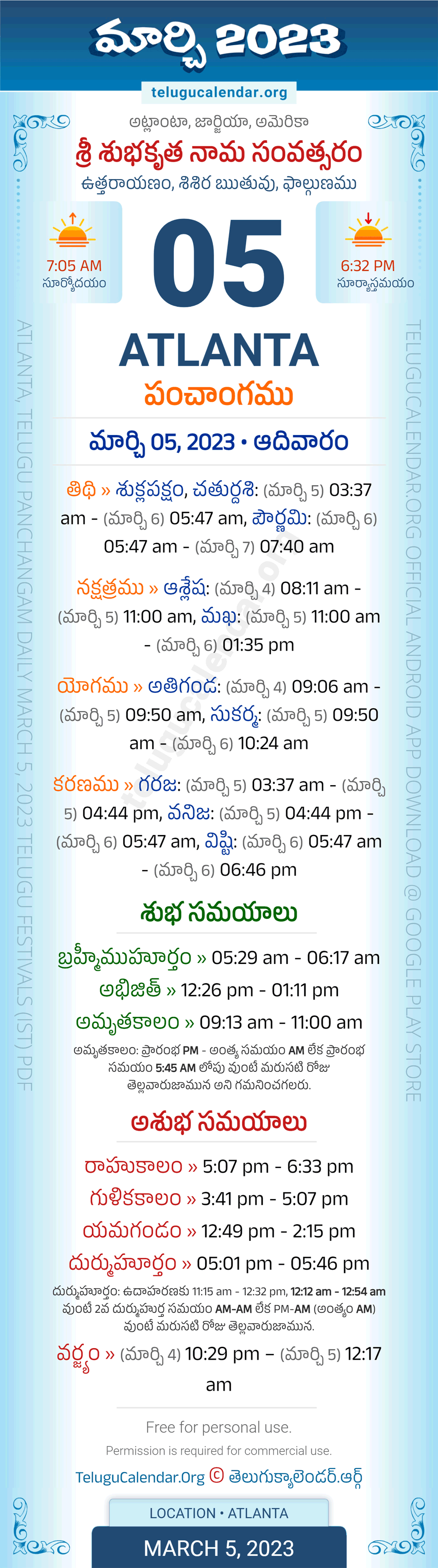 Download » March 5, 2023 » Atlanta (USA) Telugu Panchangam Daily Sheet with Auspicious and Inauspicious Timings.
