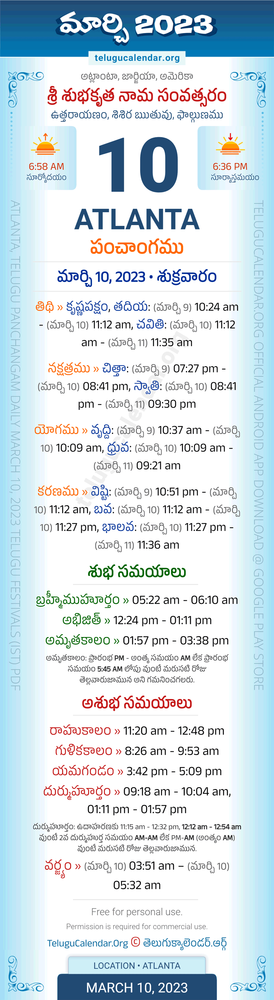Download » March 10, 2023 » Atlanta (USA) Telugu Panchangam Daily Sheet with Auspicious and Inauspicious Timings.