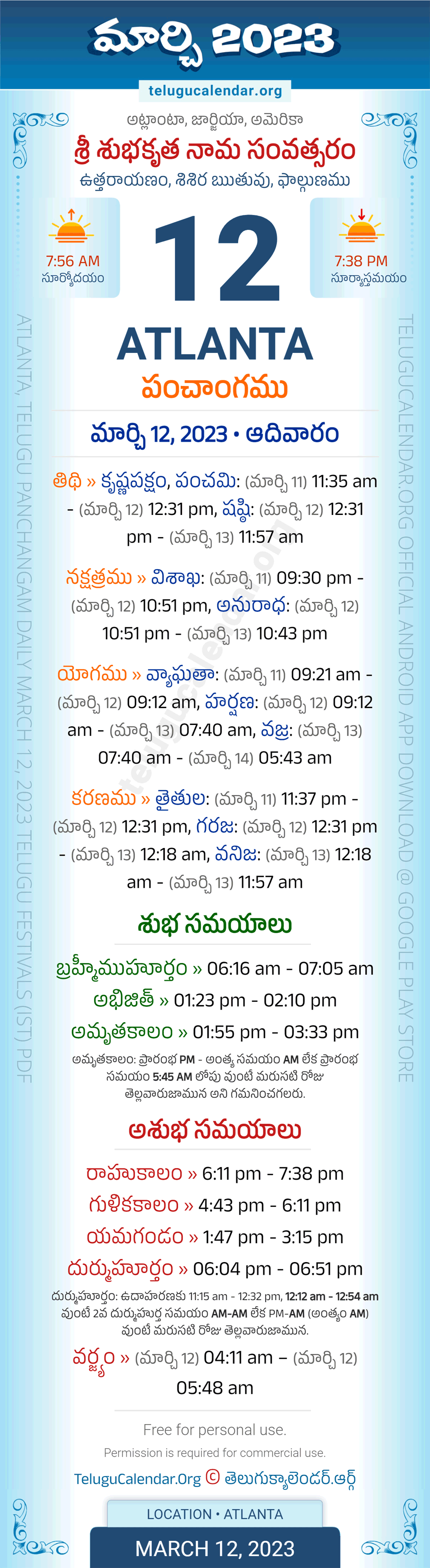 Download » March 12, 2023 » Atlanta (USA) Telugu Panchangam Daily Sheet with Auspicious and Inauspicious Timings.