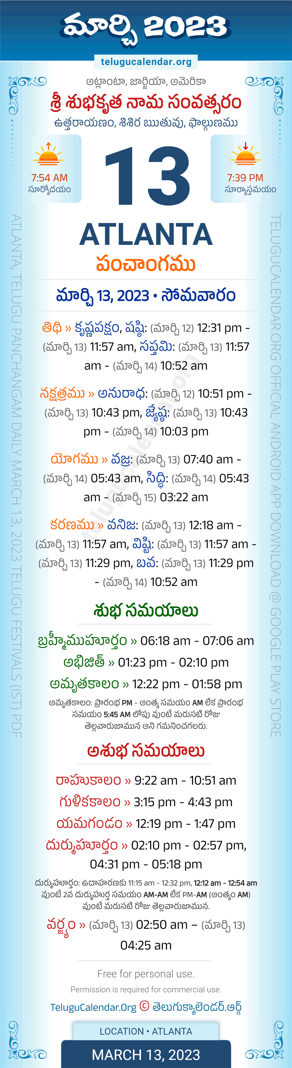 Download » March 13, 2023 » Atlanta (USA) Telugu Panchangam Daily Sheet with Auspicious and Inauspicious Timings.