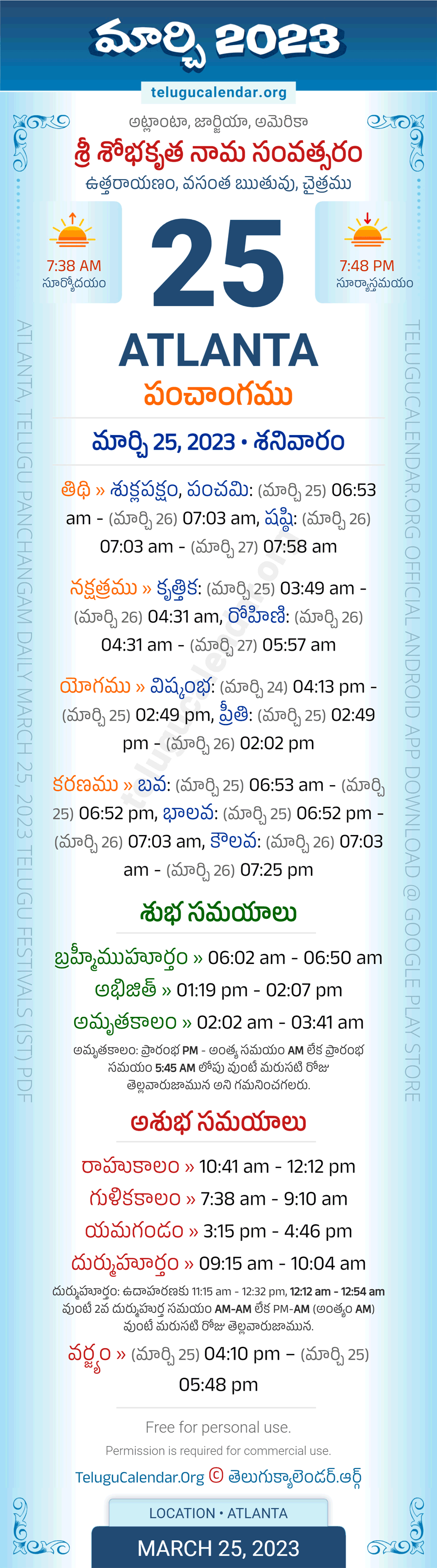 Download » March 25, 2023 » Atlanta (USA) Telugu Panchangam Daily Sheet with Auspicious and Inauspicious Timings.
