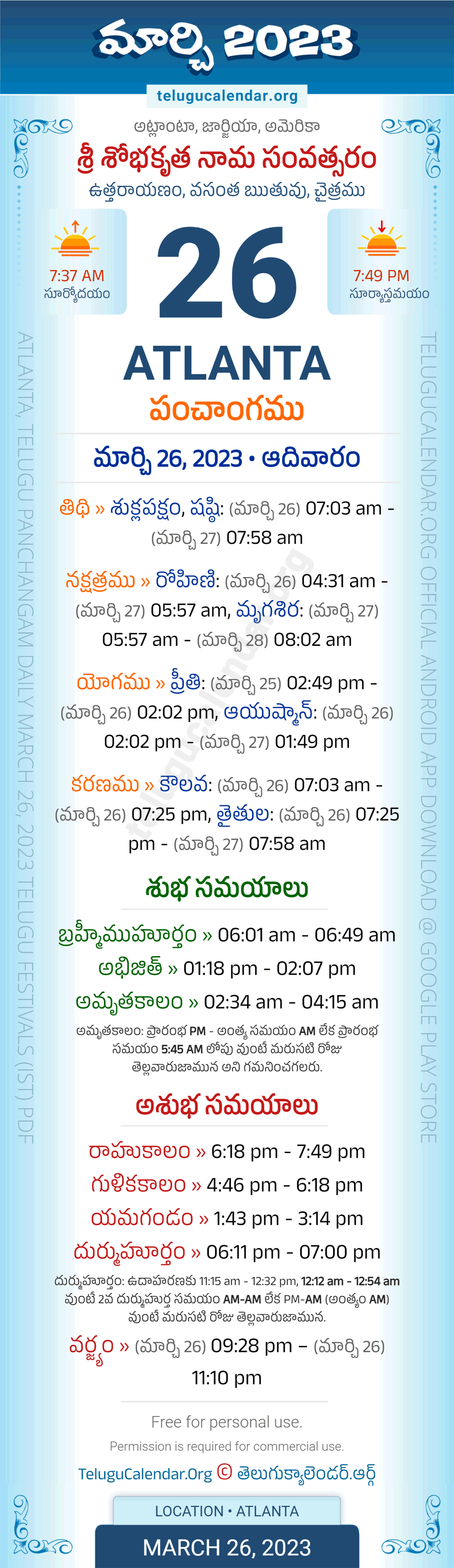 Download » March 26, 2023 » Atlanta (USA) Telugu Panchangam Daily Sheet with Auspicious and Inauspicious Timings.