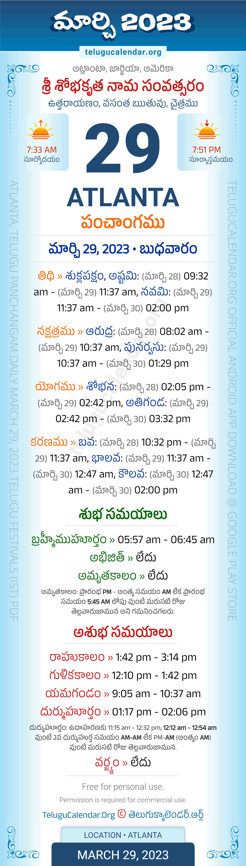 Download » March 29, 2023 » Atlanta (USA) Telugu Panchangam Daily Sheet with Auspicious and Inauspicious Timings.