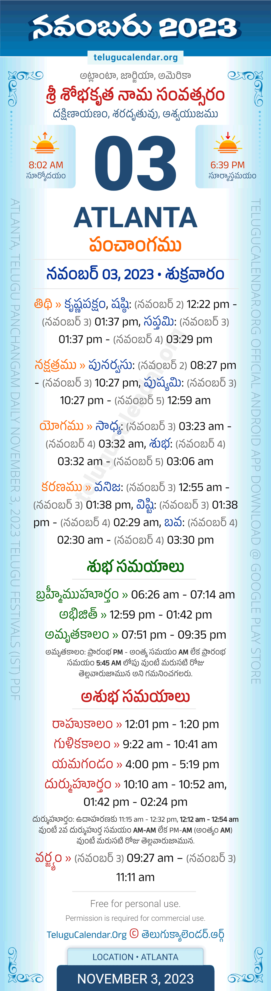 Download » November 3, 2023 » Atlanta (USA) Telugu Panchangam Daily Sheet with Auspicious and Inauspicious Timings.