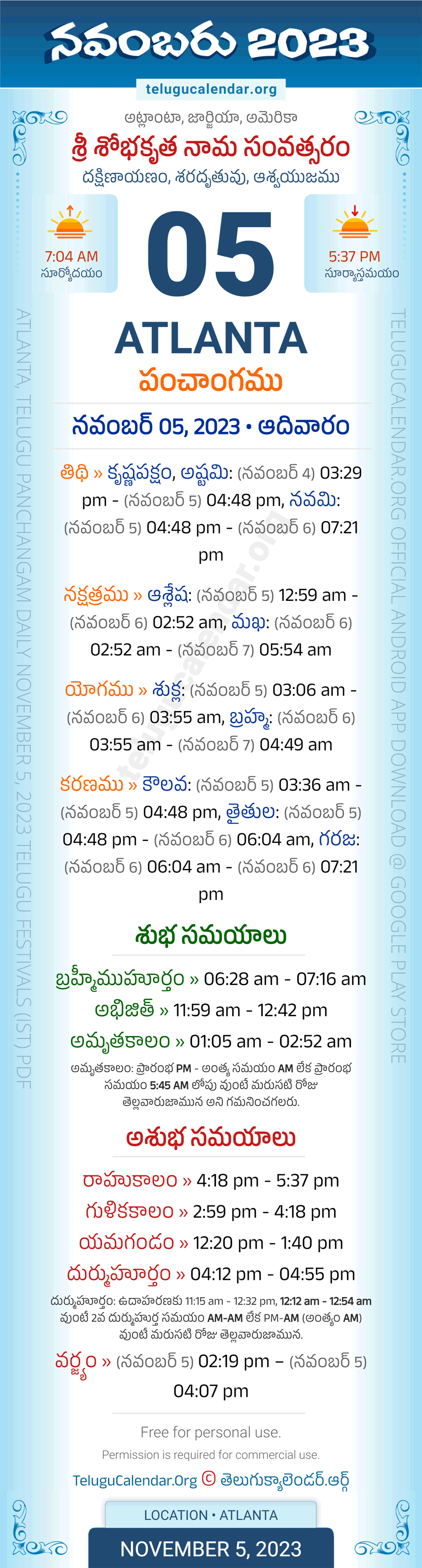 Atlanta Panchangam November 5, 2023 Daily Sheet in Telugu... Atlanta Telugu Panchangam Sunday, November 05, 2023, Today's Atlanta Tithi: Krishna Paksham, Ashtami: (Nov 4) 03:29 pm - (Nov 5) 04:48 pm, Navami: (Nov 5) 04:48 pm - (Nov 6) 07:21 pm, Today's Atlanta Nakshatram: Ashlesha: (Nov 5) 12:59 am - (Nov 6) 02:52 am, Makha: (Nov 6) 02:52 am - (Nov 7) 05:54 am, Telugu Year: Sri Sobhakritu Nama Samvatsaram, Vedic Aayana: Dakshinayanam, Vedic Rutuvu: Sharad, Chandramasa (Amanta): Ashwayujamu. Below image showing information about the 5 attributes of the day, viz., Varam, Tithi, Nakshatram, Yogam & Karanam along with starting and end timings. Read more