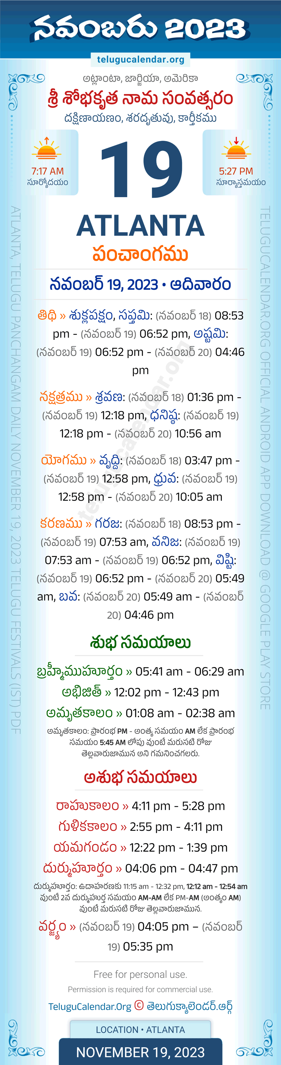 Atlanta Panchangam November 19, 2023 Daily Sheet in Telugu... Atlanta Telugu Panchangam Sunday, November 19, 2023, Today's Atlanta Tithi: Sukla Paksham, Saptami: (Nov 18) 08:53 pm - (Nov 19) 06:52 pm, Ashtami: (Nov 19) 06:52 pm - (Nov 20) 04:46 pm, Today's Atlanta Nakshatram: Sravanamu: (Nov 18) 01:36 pm - (Nov 19) 12:18 pm, Dhanishta: (Nov 19) 12:18 pm - (Nov 20) 10:56 am, Telugu Year: Sri Sobhakritu Nama Samvatsaram, Vedic Aayana: Dakshinayanam, Vedic Rutuvu: Sharad, Chandramasa (Amanta): Kartikamu. Below image showing information about the 5 attributes of the day, viz., Varam, Tithi, Nakshatram, Yogam & Karanam along with starting and end timings. Read more