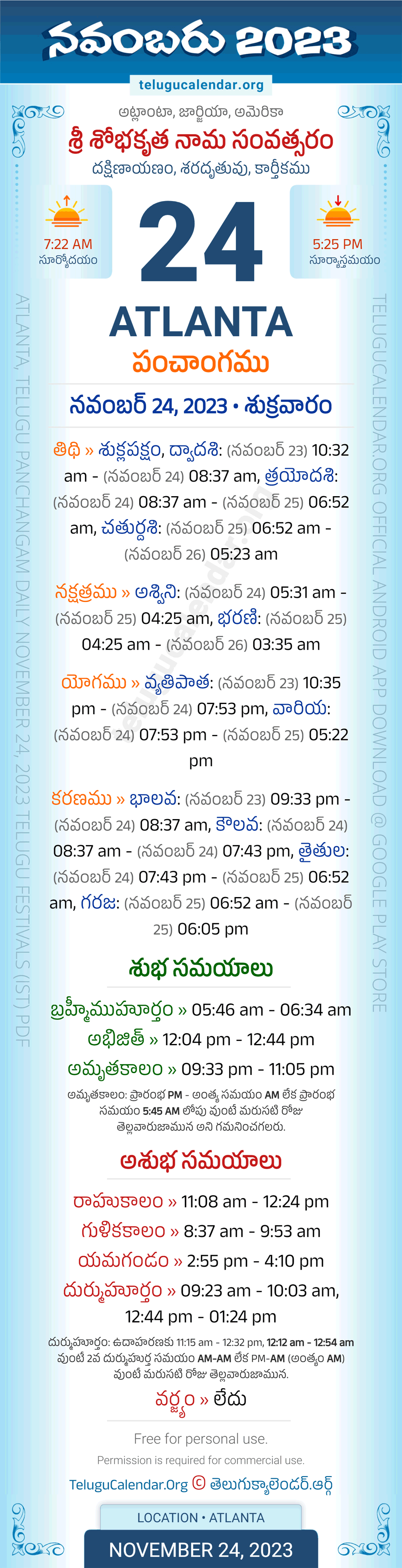 Atlanta Panchangam November 24, 2023 Daily Sheet in Telugu... Atlanta Telugu Panchangam Friday, November 24, 2023, Today's Atlanta Tithi: Sukla Paksham, Dwadasi: (Nov 23) 10:32 am - (Nov 24) 08:37 am, Trayodashi: (Nov 24) 08:37 am - (Nov 25) 06:52 am, Chaturdashi: (Nov 25) 06:52 am - (Nov 26) 05:23 am, Today's Atlanta Nakshatram: Aswini: (Nov 24) 05:31 am - (Nov 25) 04:25 am, Bharani: (Nov 25) 04:25 am - (Nov 26) 03:35 am, Telugu Year: Sri Sobhakritu Nama Samvatsaram, Vedic Aayana: Dakshinayanam, Vedic Rutuvu: Sharad, Chandramasa (Amanta): Kartikamu. Below image showing information about the 5 attributes of the day, viz., Varam, Tithi, Nakshatram, Yogam & Karanam along with starting and end timings. Read more