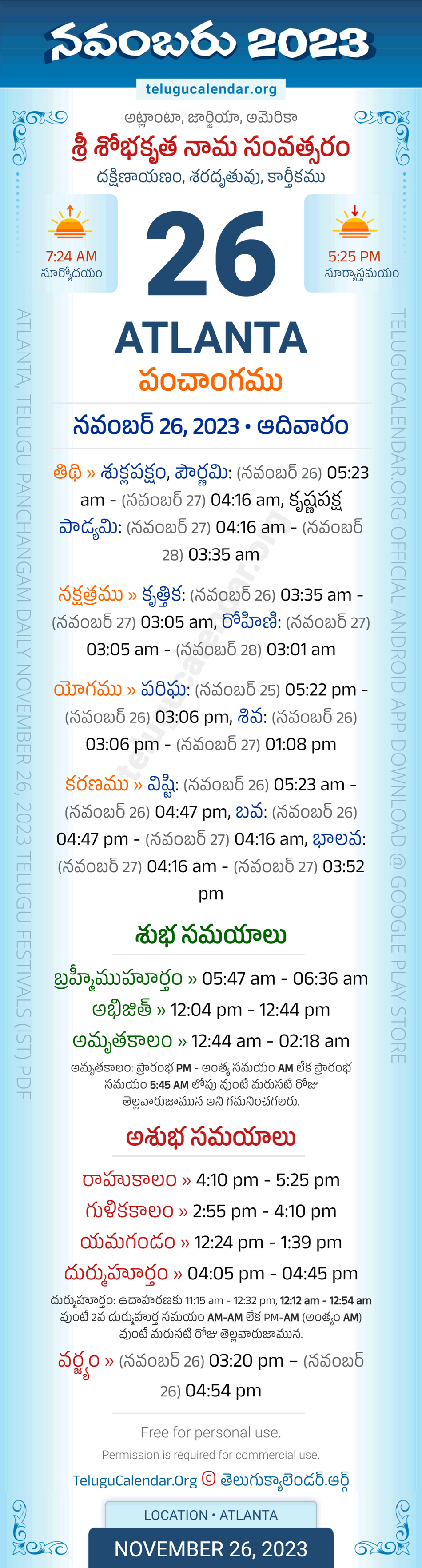 Download » November 26, 2023 » Atlanta (USA) Telugu Panchangam Daily Sheet with Auspicious and Inauspicious Timings.