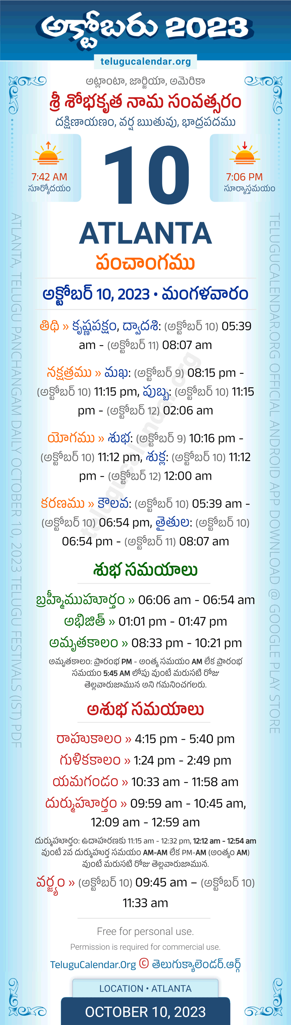 Download » October 10, 2023 » Atlanta (USA) Telugu Panchangam Daily Sheet with Auspicious and Inauspicious Timings.