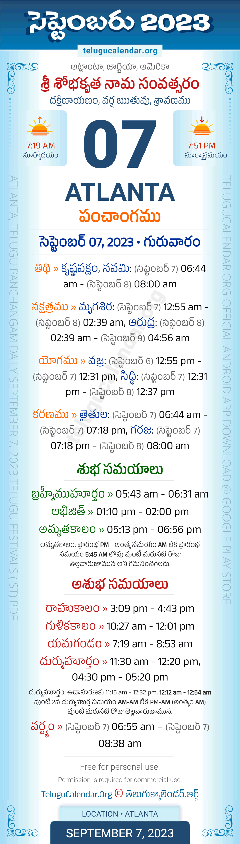 Download » September 7, 2023 » Atlanta (USA) Telugu Panchangam Daily Sheet with Auspicious and Inauspicious Timings.