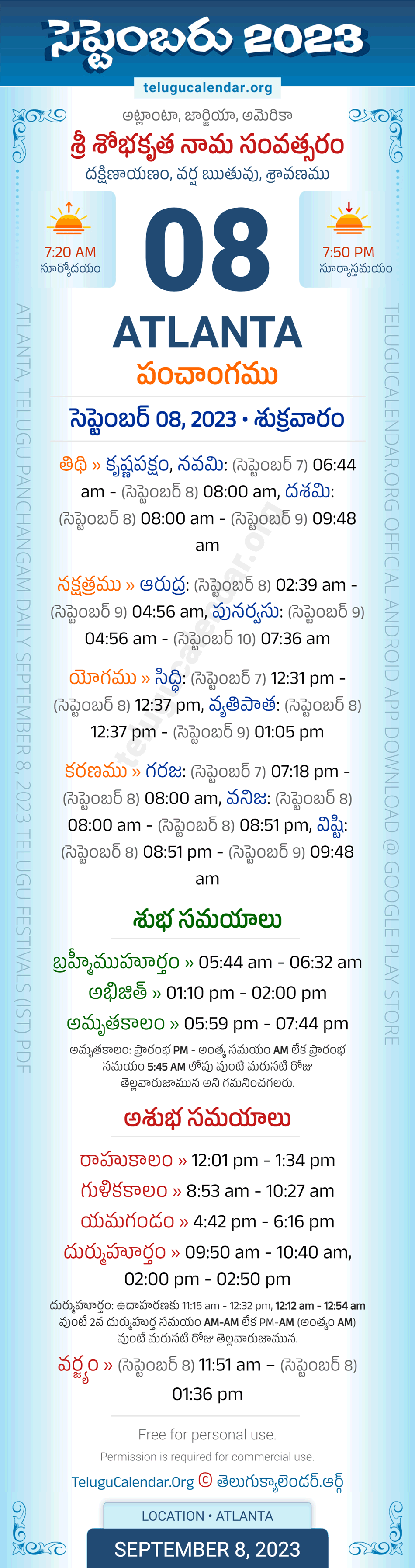 Download » September 8, 2023 » Atlanta (USA) Telugu Panchangam Daily Sheet with Auspicious and Inauspicious Timings.