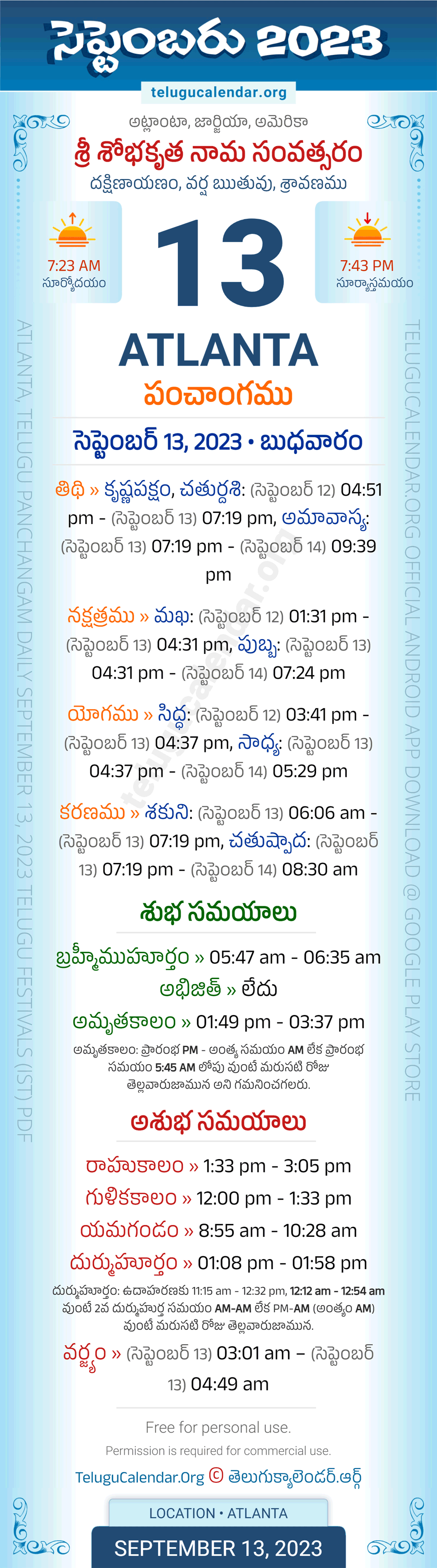 Download » September 13, 2023 » Atlanta (USA) Telugu Panchangam Daily Sheet with Auspicious and Inauspicious Timings.