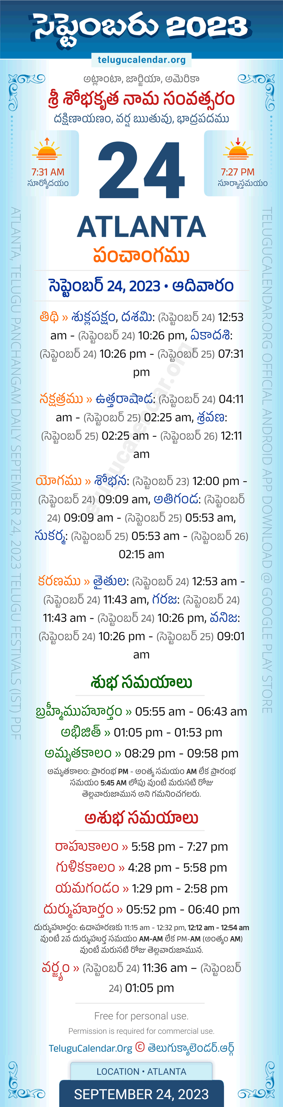 Download » September 24, 2023 » Atlanta (USA) Telugu Panchangam Daily Sheet with Auspicious and Inauspicious Timings.
