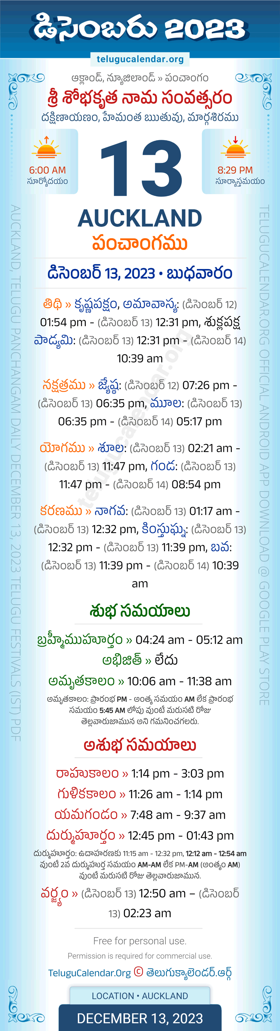 Auckland Panchangam December 13, 2023 Daily Sheet in Telugu... Auckland Telugu Panchangam Wednesday, December 13, 2023, Today's Auckland Tithi: Krishna Paksham, Amavasya: (Dec 12) 01:54 pm - (Dec 13) 12:31 pm, Sukla Paksha Padyami: (Dec 13) 12:31 pm - (Dec 14) 10:39 am, Today's Auckland Nakshatram: Jyestha: (Dec 12) 07:26 pm - (Dec 13) 06:35 pm, Moola: (Dec 13) 06:35 pm - (Dec 14) 05:17 pm, Telugu Year: Sri Sobhakritu Nama Samvatsaram, Vedic Aayana: Dakshinayanam, Vedic Rutuvu: Hemanta, Chandramasa (Amanta): Margasiramu. Below image showing information about the 5 attributes of the day, viz., Varam, Tithi, Nakshatram, Yogam & Karanam along with starting and end timings. Read more