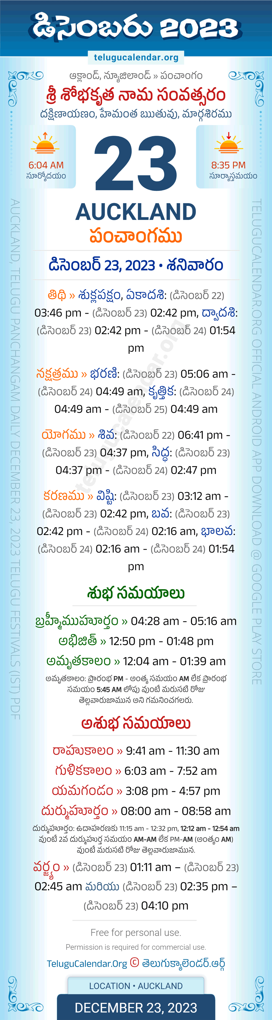 Auckland Panchangam December 23, 2023 Daily Sheet in Telugu... Auckland Telugu Panchangam Saturday, December 23, 2023, Today's Auckland Tithi: Sukla Paksham, Ekadashi: (Dec 22) 03:46 pm - (Dec 23) 02:42 pm, Dwadasi: (Dec 23) 02:42 pm - (Dec 24) 01:54 pm, Today's Auckland Nakshatram: Bharani: (Dec 23) 05:06 am - (Dec 24) 04:49 am, Krithika: (Dec 24) 04:49 am - (Dec 25) 04:49 am, Telugu Year: Sri Sobhakritu Nama Samvatsaram, Vedic Aayana: Dakshinayanam, Vedic Rutuvu: Hemanta, Chandramasa (Amanta): Margasiramu. Below image showing information about the 5 attributes of the day, viz., Varam, Tithi, Nakshatram, Yogam & Karanam along with starting and end timings. Read more