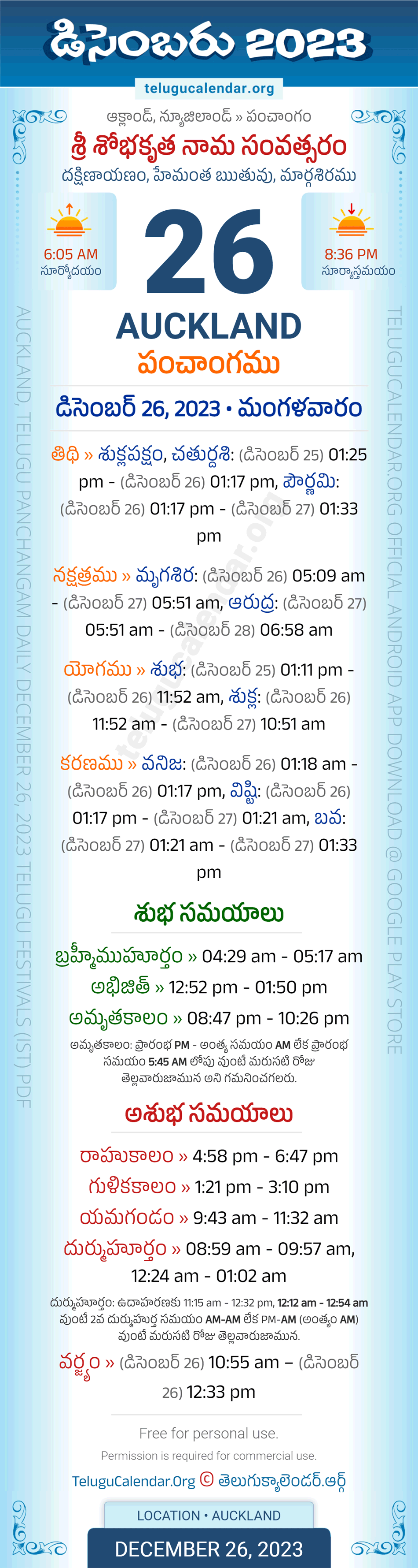 Auckland Panchangam December 26, 2023 Daily Sheet in Telugu... Auckland Telugu Panchangam Tuesday, December 26, 2023, Today's Auckland Tithi: Sukla Paksham, Chaturdashi: (Dec 25) 01:25 pm - (Dec 26) 01:17 pm, Pournami: (Dec 26) 01:17 pm - (Dec 27) 01:33 pm, Today's Auckland Nakshatram: Mrigasira: (Dec 26) 05:09 am - (Dec 27) 05:51 am, Arudra: (Dec 27) 05:51 am - (Dec 28) 06:58 am, Telugu Year: Sri Sobhakritu Nama Samvatsaram, Vedic Aayana: Dakshinayanam, Vedic Rutuvu: Hemanta, Chandramasa (Amanta): Margasiramu. Below image showing information about the 5 attributes of the day, viz., Varam, Tithi, Nakshatram, Yogam & Karanam along with starting and end timings. Read more