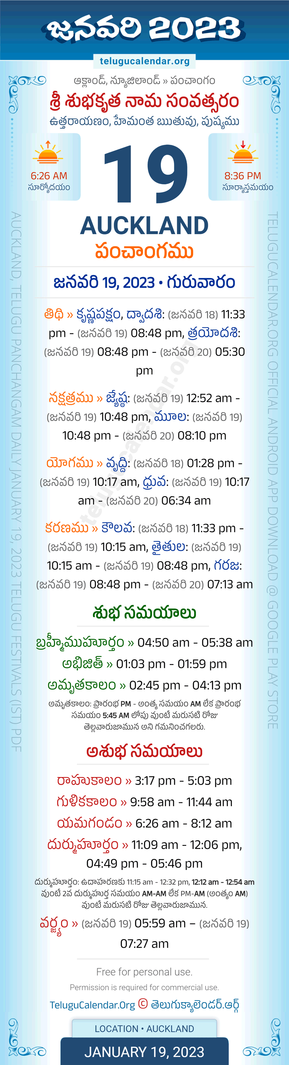Download » January 19, 2023 » Auckland (New Zealand) Telugu Panchangam Daily Sheet with Auspicious and Inauspicious Timings.