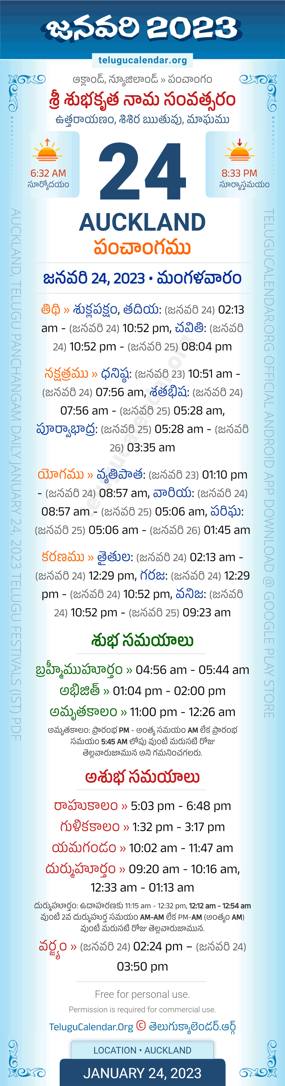 Download » January 24, 2023 » Auckland (New Zealand) Telugu Panchangam Daily Sheet with Auspicious and Inauspicious Timings.