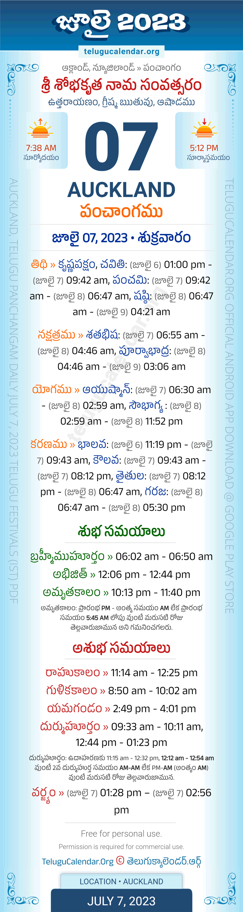 Download » July 7, 2023 » Auckland (New Zealand) Telugu Panchangam Daily Sheet with Auspicious and Inauspicious Timings.
