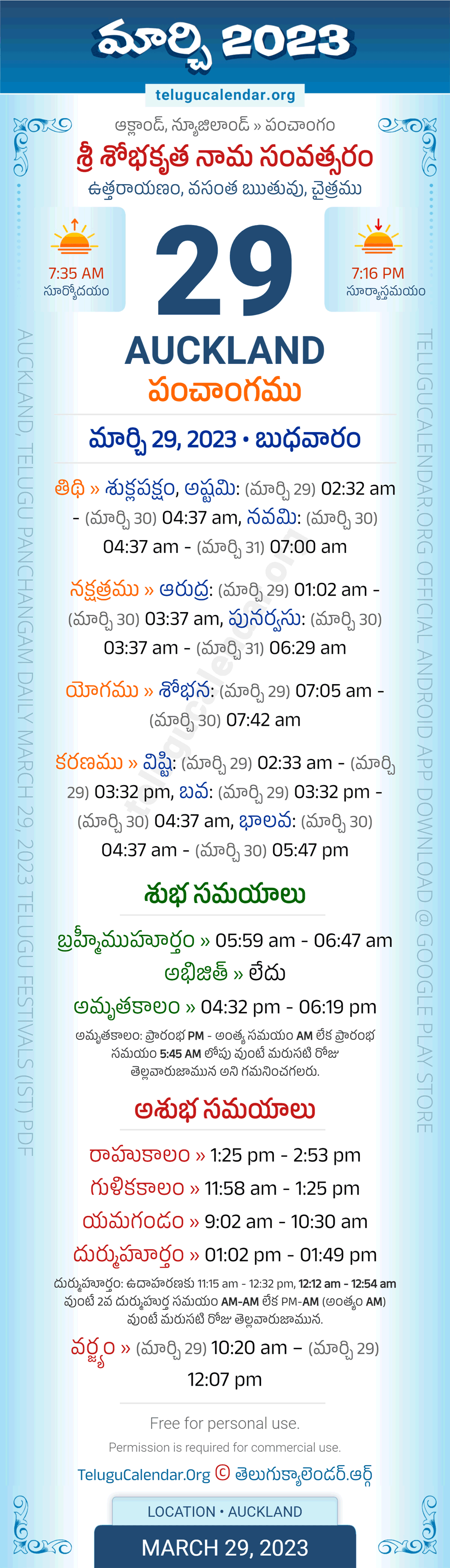 Download » March 29, 2023 » Auckland (New Zealand) Telugu Panchangam Daily Sheet with Auspicious and Inauspicious Timings.