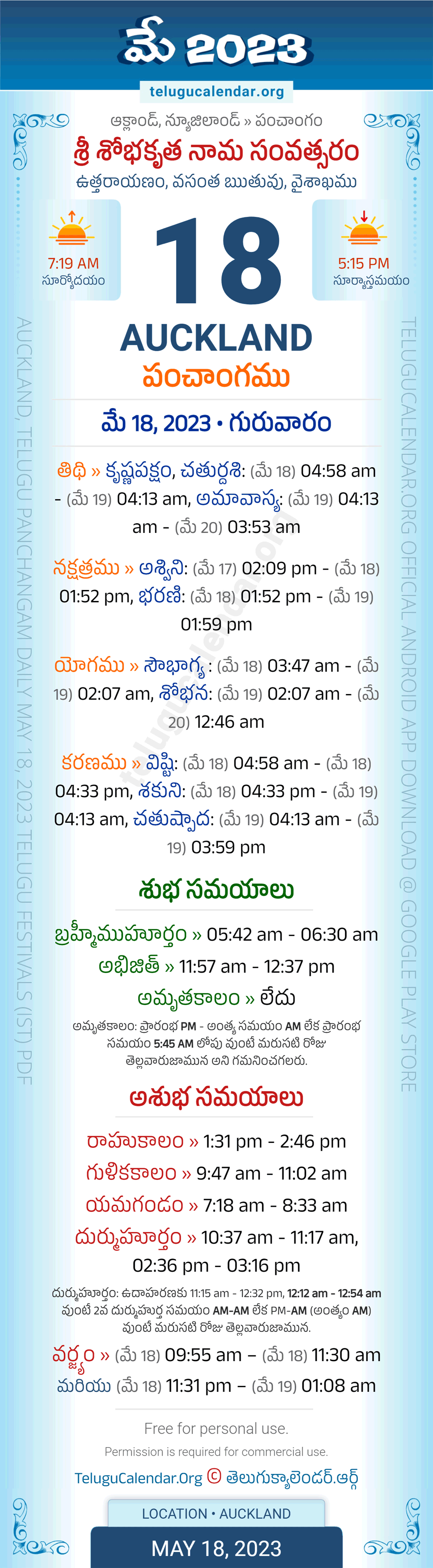 Download » May 18, 2023 » Auckland (New Zealand) Telugu Panchangam Daily Sheet with Auspicious and Inauspicious Timings.