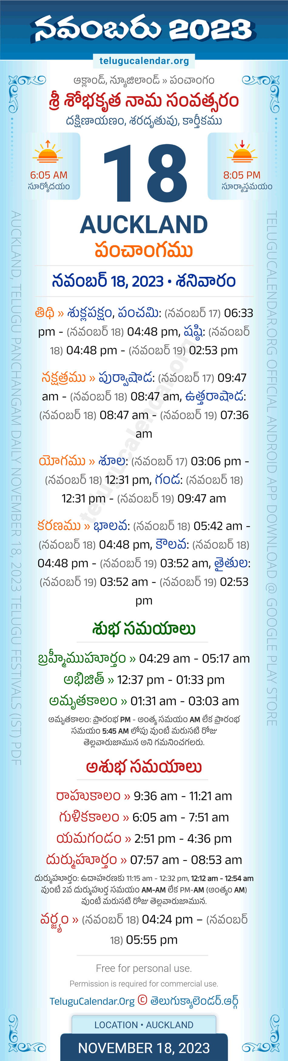 Auckland Panchangam November 18, 2023 Daily Sheet in Telugu... Auckland Telugu Panchangam Saturday, November 18, 2023, Today's Auckland Tithi: Sukla Paksham, Panchami: (Nov 17) 06:33 pm - (Nov 18) 04:48 pm, Shashthi: (Nov 18) 04:48 pm - (Nov 19) 02:53 pm, Today's Auckland Nakshatram: Purva Ashadha: (Nov 17) 09:47 am - (Nov 18) 08:47 am, Uttara Ashadha: (Nov 18) 08:47 am - (Nov 19) 07:36 am, Telugu Year: Sri Sobhakritu Nama Samvatsaram, Vedic Aayana: Dakshinayanam, Vedic Rutuvu: Sharad, Chandramasa (Amanta): Kartikamu. Below image showing information about the 5 attributes of the day, viz., Varam, Tithi, Nakshatram, Yogam & Karanam along with starting and end timings. Read more