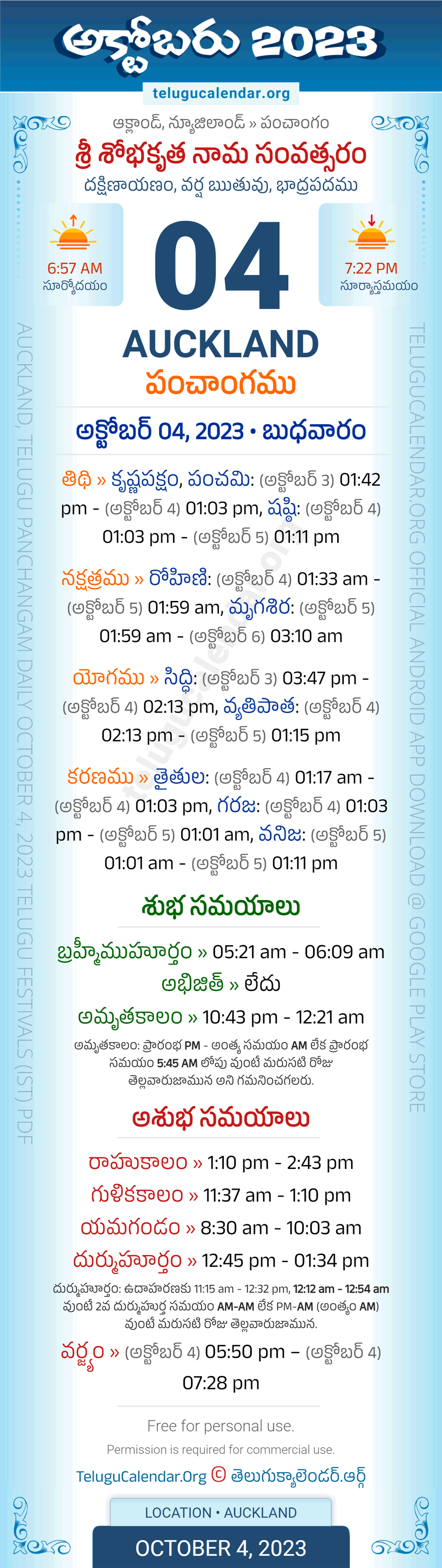 Download » October 4, 2023 » Auckland (New Zealand) Telugu Panchangam Daily Sheet with Auspicious and Inauspicious Timings.