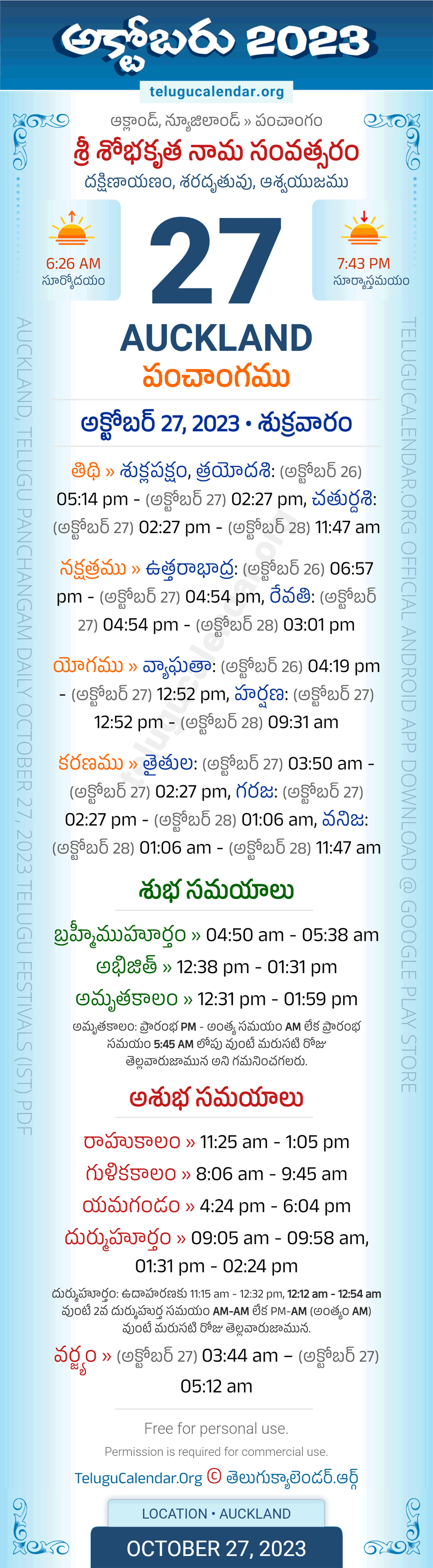 Download » October 27, 2023 » Auckland (New Zealand) Telugu Panchangam Daily Sheet with Auspicious and Inauspicious Timings.