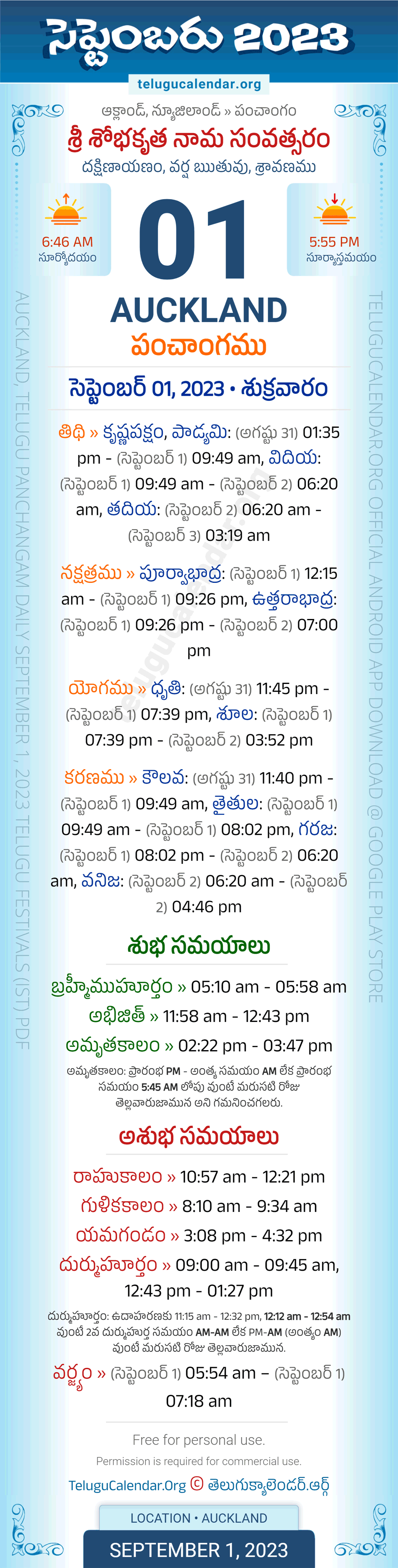 Download » September 1, 2023 » Auckland (New Zealand) Telugu Panchangam Daily Sheet with Auspicious and Inauspicious Timings.