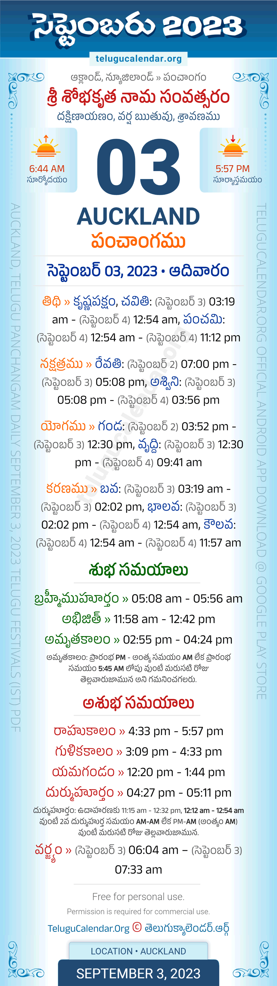 Auckland Panchangam September 3, 2023 Daily Sheet in Telugu... Auckland Telugu Panchangam Sunday, September 03, 2023, Today's Auckland Tithi: Krishna Paksham, Chavithi: (Sep 3) 03:19 am - (Sep 4) 12:54 am, Panchami: (Sep 4) 12:54 am - (Sep 4) 11:12 pm, Today's Auckland Nakshatram: Revathi: (Sep 2) 07:00 pm - (Sep 3) 05:08 pm, Aswini: (Sep 3) 05:08 pm - (Sep 4) 03:56 pm, Telugu Year: Sri Sobhakritu Nama Samvatsaram, Vedic Aayana: Dakshinayanam, Vedic Rutuvu: Varsha, Chandramasa (Amanta): Sravanamu. Below image showing information about the 5 attributes of the day, viz., Varam, Tithi, Nakshatram, Yogam & Karanam along with starting and end timings. Read more