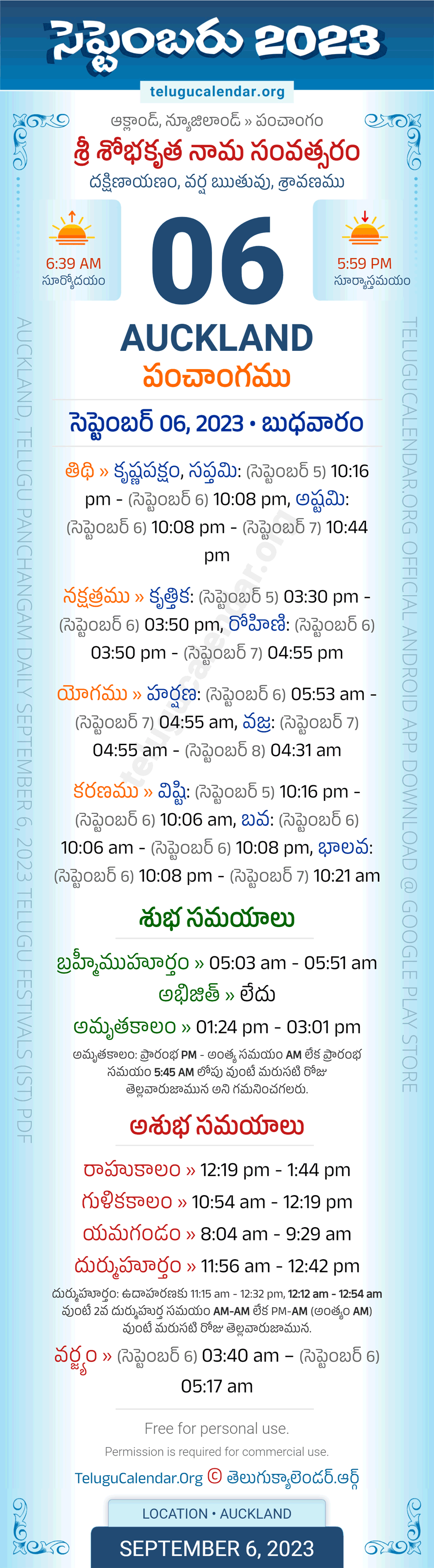 Auckland Panchangam September 6, 2023 Daily Sheet in Telugu... Auckland Telugu Panchangam Wednesday, September 06, 2023, Today's Auckland Tithi: Krishna Paksham, Saptami: (Sep 5) 10:16 pm - (Sep 6) 10:08 pm, Ashtami: (Sep 6) 10:08 pm - (Sep 7) 10:44 pm, Today's Auckland Nakshatram: Krithika: (Sep 5) 03:30 pm - (Sep 6) 03:50 pm, Krithika: (Sep 6) 03:50 pm - (Sep 7) 04:55 pm, Telugu Year: Sri Sobhakritu Nama Samvatsaram, Vedic Aayana: Dakshinayanam, Vedic Rutuvu: Varsha, Chandramasa (Amanta): Sravanamu. Below image showing information about the 5 attributes of the day, viz., Varam, Tithi, Nakshatram, Yogam & Karanam along with starting and end timings. Read more