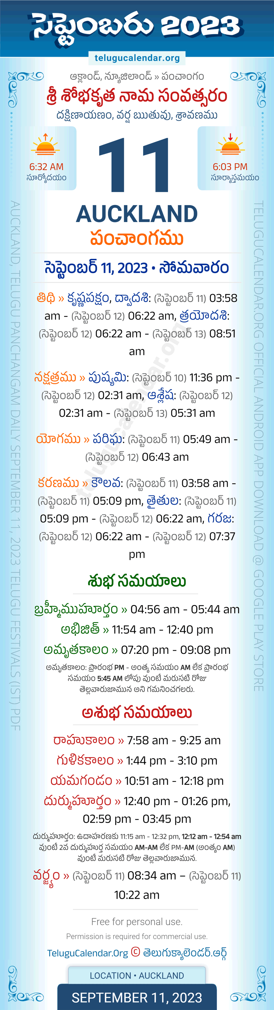 Auckland Panchangam September 11, 2023 Daily Sheet in Telugu... Auckland Telugu Panchangam Monday, September 11, 2023, Today's Auckland Tithi: Krishna Paksham, Dwadasi: (Sep 11) 03:58 am - (Sep 12) 06:22 am, Trayodashi: (Sep 12) 06:22 am - (Sep 13) 08:51 am, Today's Auckland Nakshatram: Pushyami: (Sep 10) 11:36 pm - (Sep 12) 02:31 am, Ashlesha: (Sep 12) 02:31 am - (Sep 13) 05:31 am, Telugu Year: Sri Sobhakritu Nama Samvatsaram, Vedic Aayana: Dakshinayanam, Vedic Rutuvu: Varsha, Chandramasa (Amanta): Sravanamu. Below image showing information about the 5 attributes of the day, viz., Varam, Tithi, Nakshatram, Yogam & Karanam along with starting and end timings. Read more
