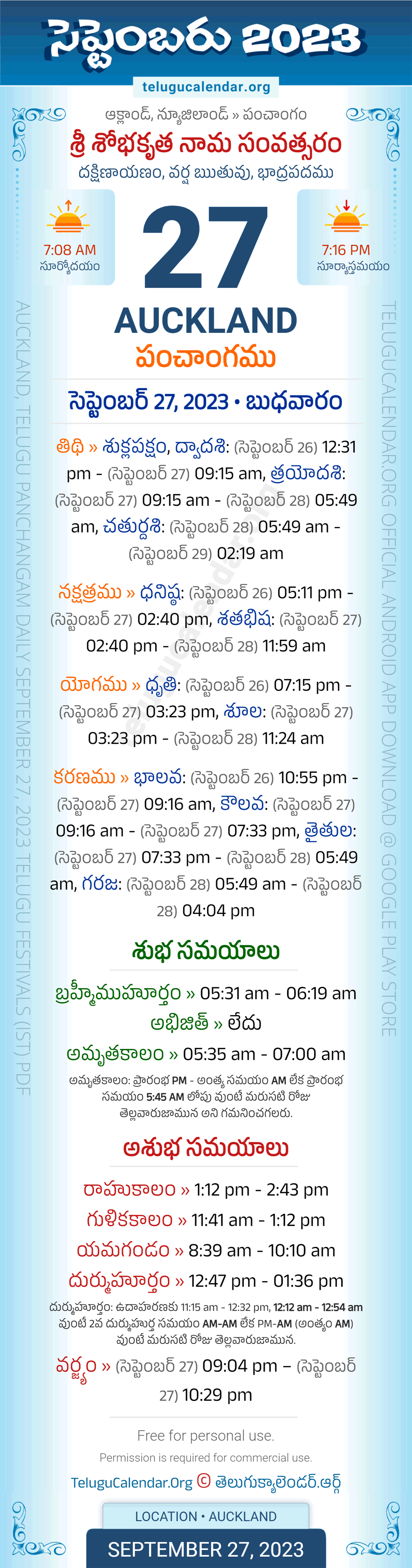 Download » September 27, 2023 » Auckland (New Zealand) Telugu Panchangam Daily Sheet with Auspicious and Inauspicious Timings.