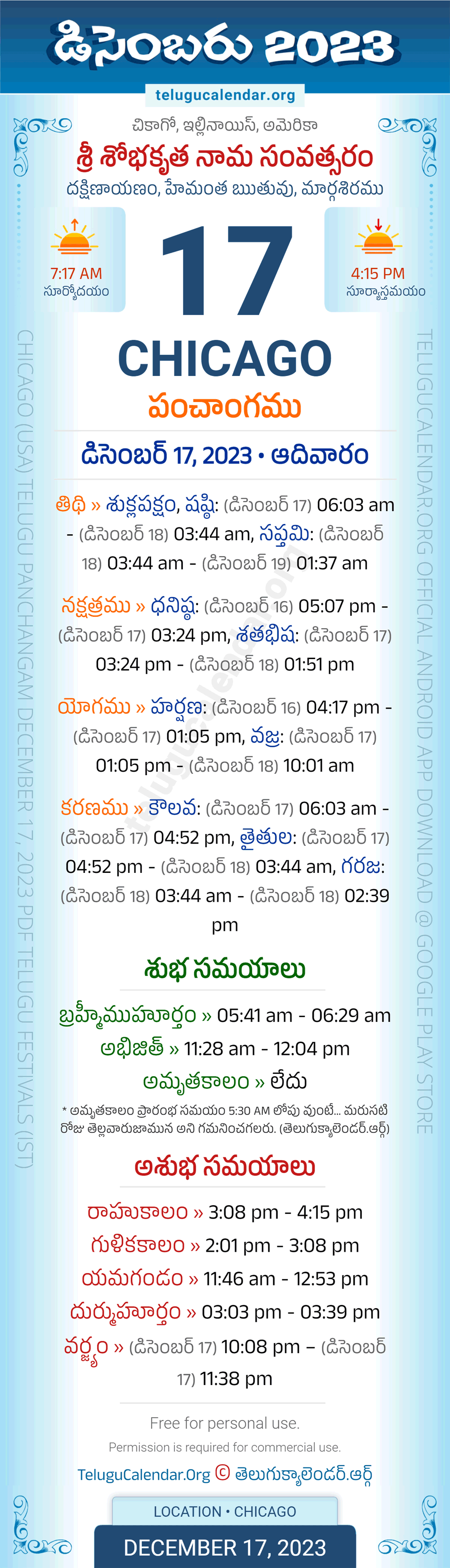 Download » December 17, 2023 » Chicago (USA) Telugu Panchangam Daily Sheet with Auspicious and Inauspicious Timings.