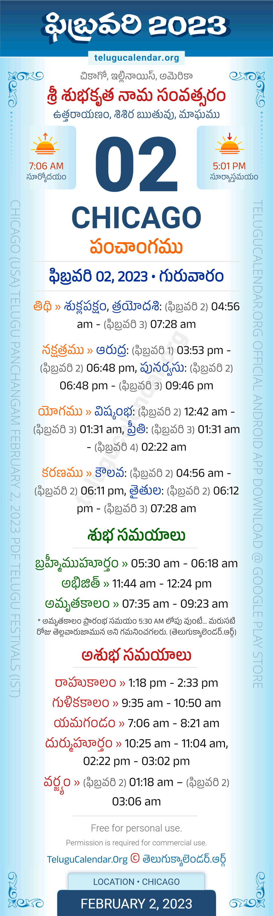 Chicago Panchangam February 2, 2023 Daily Sheet in Telugu... Chicago Telugu Panchangam Thursday, February 02, 2023, Today's Chicago Tithi: Sukla Paksham, Trayodashi: (Feb 2) 04:56 am - (Feb 3) 07:28 am, Today's Chicago Nakshatram: Arudra: (Feb 1) 03:53 pm - (Feb 2) 06:48 pm, Punarvasu: (Feb 2) 06:48 pm - (Feb 3) 09:46 pm, Telugu Year: Sri Subhakritu Nama Samvatsaram, Vedic Aayana: Uttarayanam, Vedic Rutuvu: Shishira, Chandramasa (Amanta): Maghamu. Below image showing information about the 5 attributes of the day, viz., Varam, Tithi, Nakshatram, Yogam & Karanam along with starting and end timings. Read more