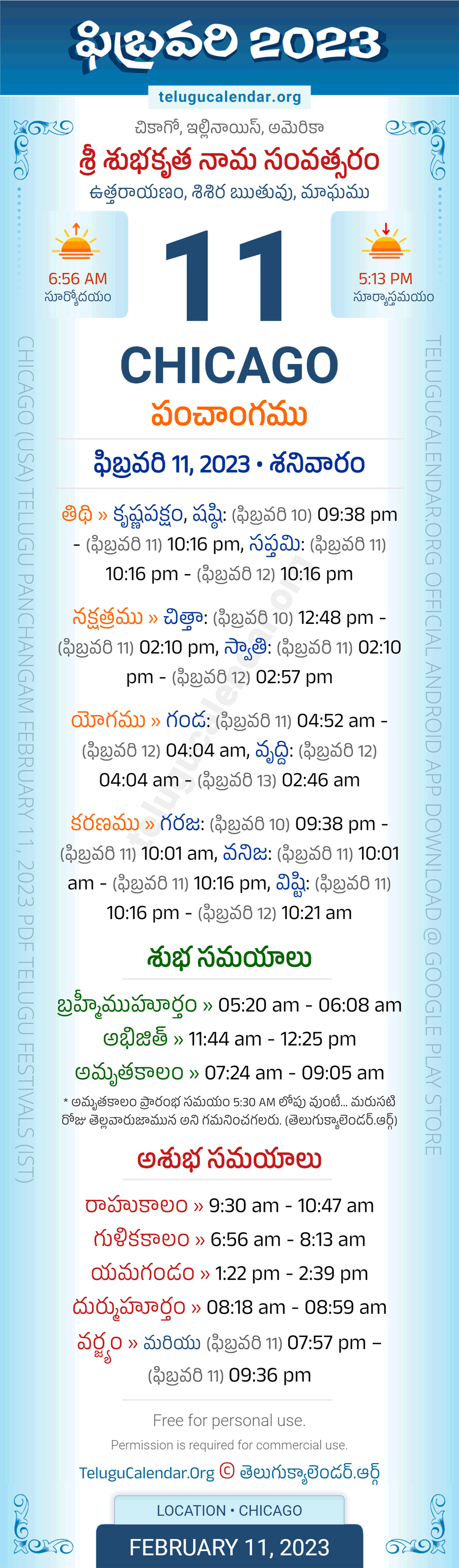 Chicago Panchangam February 11, 2023 Daily Sheet in Telugu... Chicago Telugu Panchangam Saturday, February 11, 2023, Today's Chicago Tithi: Krishna Paksham, Shashthi: (Feb 10) 09:38 pm - (Feb 11) 10:16 pm, Saptami: (Feb 11) 10:16 pm - (Feb 12) 10:16 pm, Today's Chicago Nakshatram: Chiththa: (Feb 10) 12:48 pm - (Feb 11) 02:10 pm, Swathi: (Feb 11) 02:10 pm - (Feb 12) 02:57 pm, Telugu Year: Sri Subhakritu Nama Samvatsaram, Vedic Aayana: Uttarayanam, Vedic Rutuvu: Shishira, Chandramasa (Amanta): Maghamu. Below image showing information about the 5 attributes of the day, viz., Varam, Tithi, Nakshatram, Yogam & Karanam along with starting and end timings. Read more